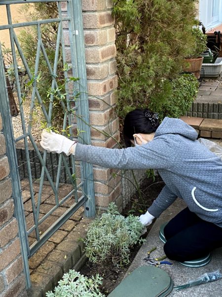 こちらのお客様は、門の前のスペースを素敵にしたいとのことで、モッコウバラを植えて、針金を取り付ける作業を一緒にしました。