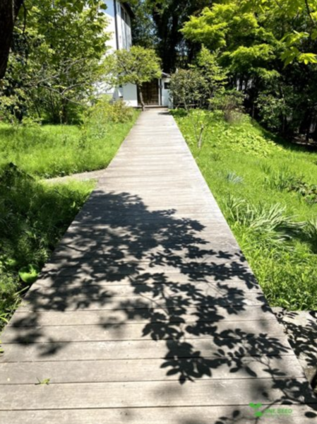 春の木漏れ日の中をまっすぐに伸びたハードウッドの木道。木道に映る木々の新緑の陰。